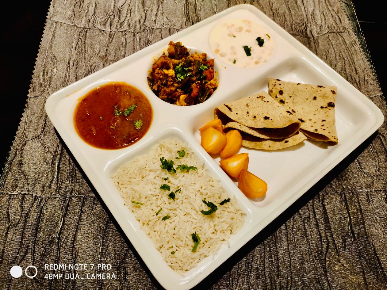 Rajmah or Kadi Pakoda, Mixed Vegetables or Chana Masala, Onion, Raita, Rice & 2 Tawa Chapati